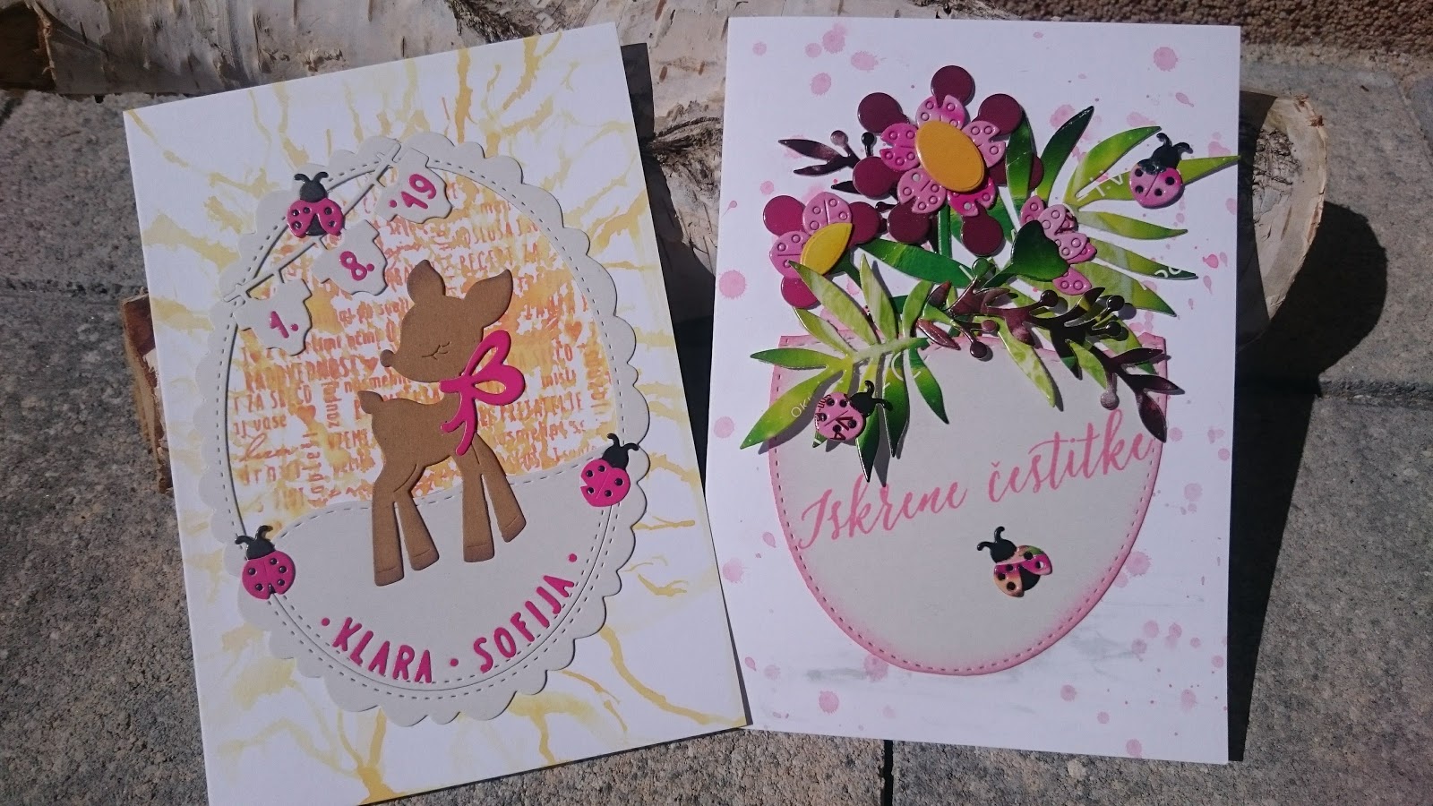 Prvotna verzija je imela celo listje, dokler ni Mija dobila voščilnice v roke.... ampak tako je efekt še bolj vintage, a ne ;).