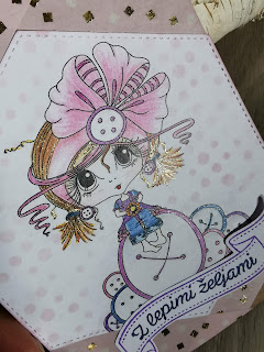 Preko je dodana papirna čipka, napis vse najboljše ter vrv iz jute in droben cvetek (darilo pri Scrapping 4 fun). Še voščilo in metuljčki za piko na i pa je šla na pot.